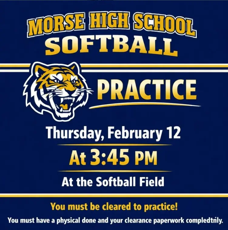 HEY TIGERS! ARE YOU INTERESTED IN PLAYING SOFTBALL? MORSE SOFTBALL WILL BE HOLDING A CLINIC ON THURSDAY, FEBRUARY 12 @ THE SOFTBALL FIELD. MAKE SURE TO BRING WATER, ATHLETIC ATTIRE, GLOVE & BAT. ARRIVE AT 3:15 FOR WARMUPS. MAKE SURE YOUR PHYSICAL IS CLEARED. SEE YOU THERE! 🐯